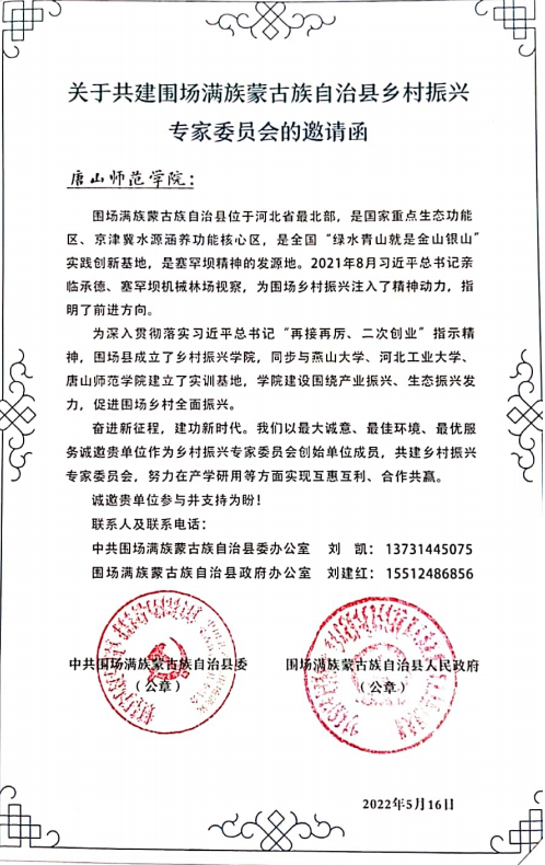 为深入贯彻落实习近平总书记“再接再厉,二次创业”指示精神,围场县成立了乡村振兴学院,同步与网赌官网和燕山大学、河北工业大学建立了实训基地,学院建设围绕产业振兴、生态振兴发力,促进围场乡村全面振兴,力争将围场打造成为北方“乡村振兴样板县”。网赌官网受邀作为乡村振兴专家委员会创始单位成员,共建乡村振兴专家委员会,将发挥高校的教学科研和人才优势,努力在产学研用等方面实现互惠互利,合作共赢。